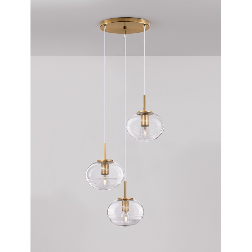 Material: Clear Glass & White Cord & Brass gold Metal Bulb Type: LED E27 3x12 Watt 230 Volt..